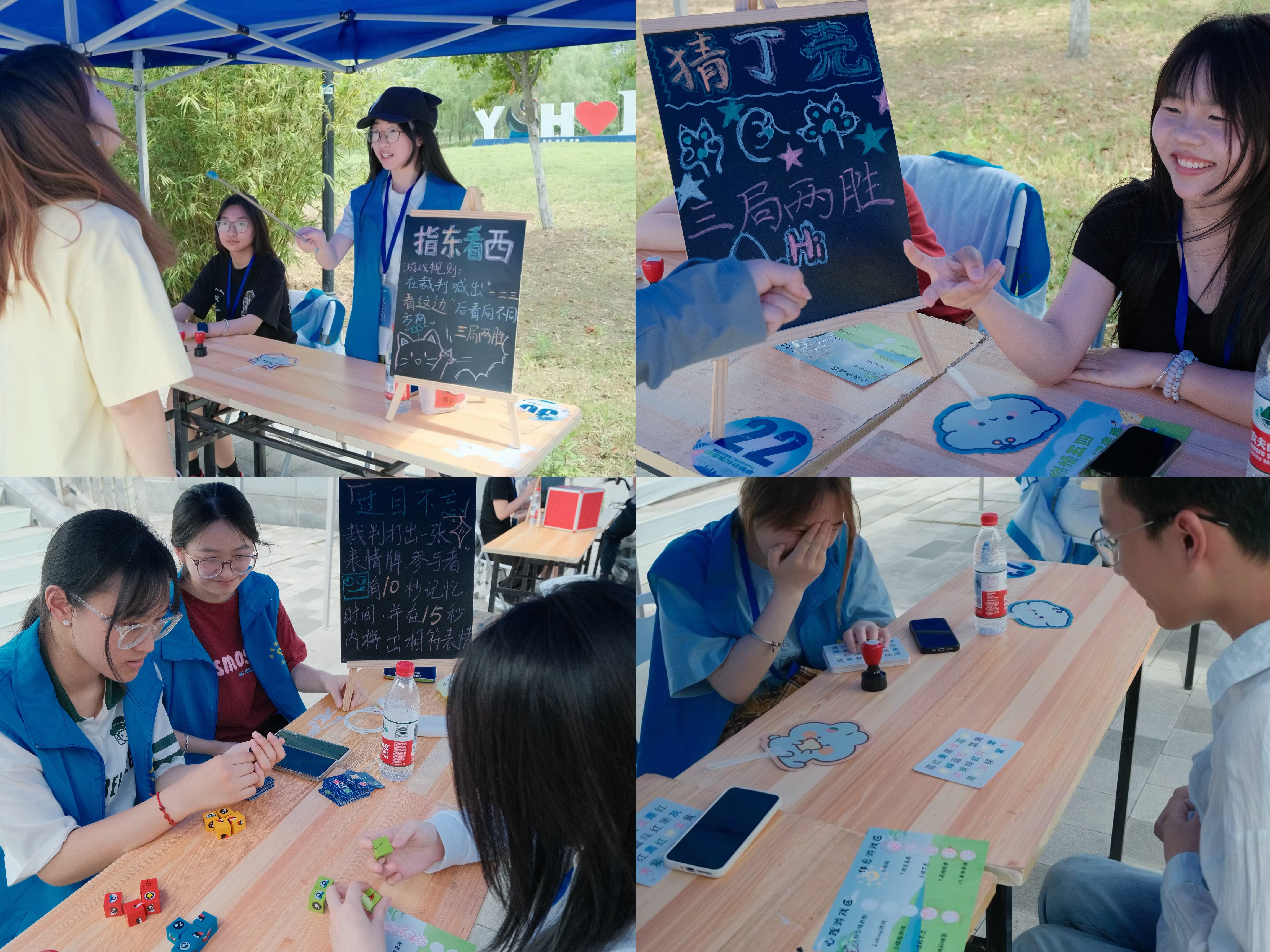 下午2点,游园会正式拉开帷幕。参与者首先在签到处领取游园集章卡,随后前往各个游戏摊位进行挑战。活动现场共设置了两个区域,10个趣味游戏。心理游戏区考验参与者的专注力、反应力和团队协作能力,让参与者们在思维的碰撞中挑战自我;信任游戏需要参与者们相互配合、彼此信任,在默契的协作中感受团队的力量;过目不忘和快问快答则激发了大家的知识储备和应变能力。休闲游戏区则充满了轻松与欢乐的氛围,蹴鞠让师生们体验了传统游戏的魅力;指东看西考验着大家的反应灵敏度,现场不时传来阵阵欢笑;猜丁壳、原地踏步和夹弹子球等经典游戏,唤起了大家的童年回忆,大家玩得不亦乐乎。