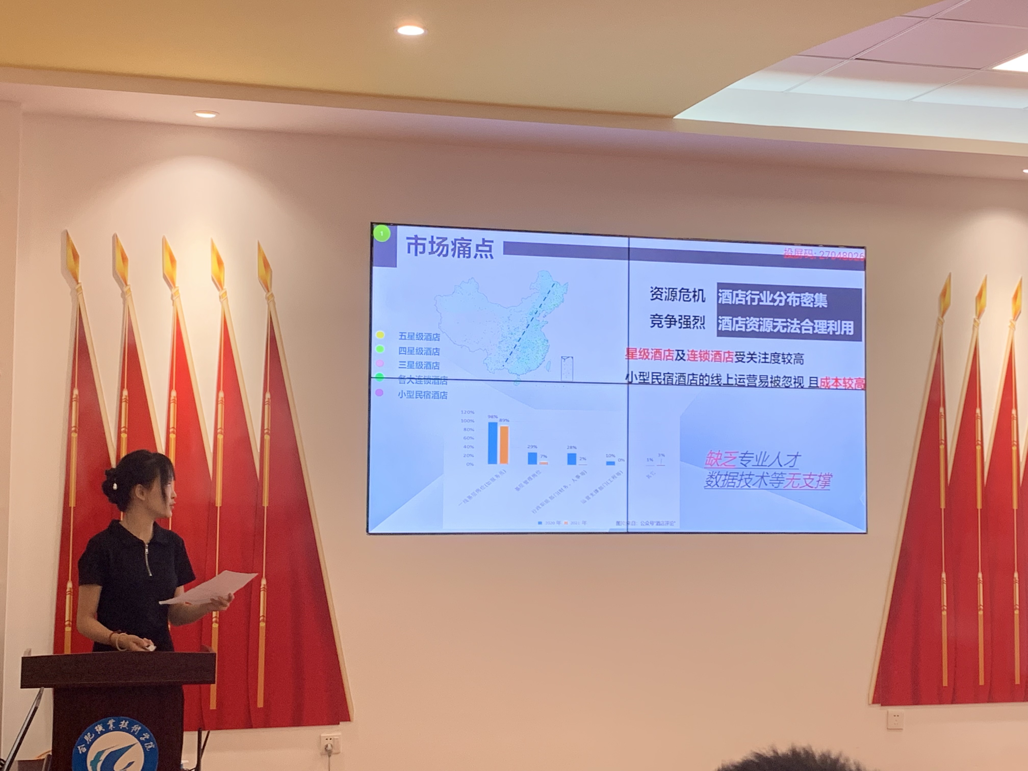 校赛分为“职教赛道”和“青年红色筑梦之旅”两大赛道,参赛选手需进行PPT展示与现场答辩两个环节。选手们就项目背景、特色与创新点、市场需求及财务规划等方面进行项目汇报,专家评委们进行提问和点评。此次项目展示中,有专注于中小员工的旅游研学,有致力于企业品牌打造的电商代运营和直播,有努力实现乡村振兴的蓝莓产业园,有解决听力障碍的助听设备,最终“智慧大棚”创业项目脱颖而出,获得一等奖。