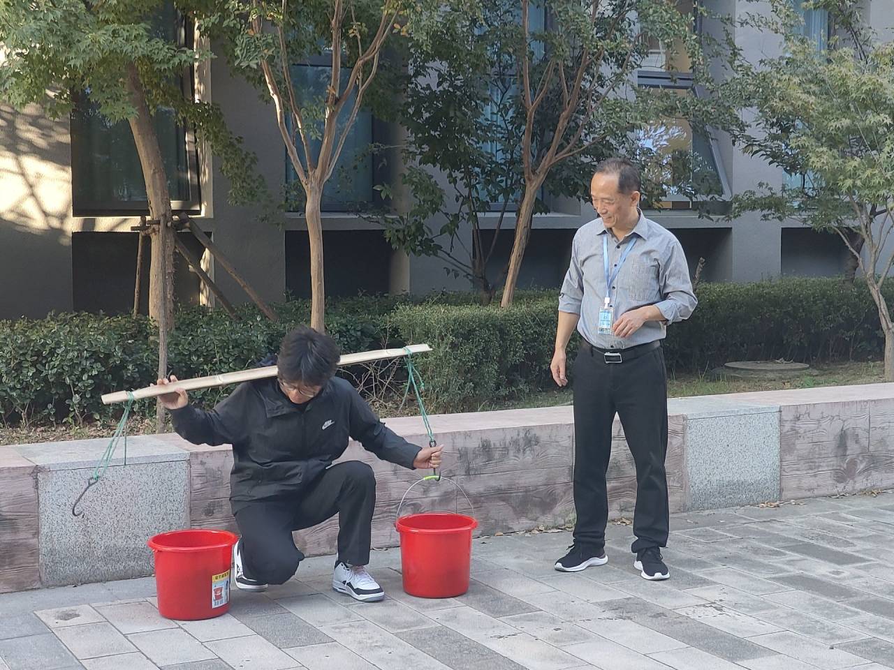 在实际教学中,指导老师首先阐述了劳动的重要性及开展劳动教育的意义,接着讲解了“拴晒衣绳”及“挑担子”的动作要领和操作步骤并给员工作了演示,最后指导员工亲自动手操作。