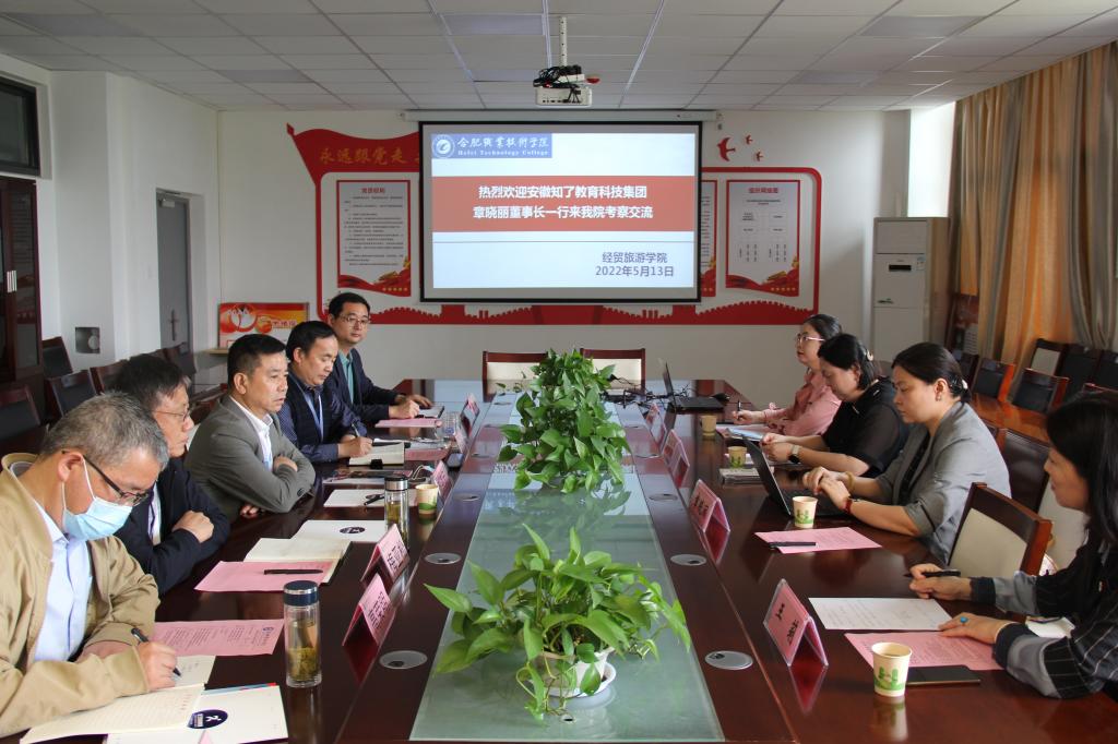 为进一步深入贯彻“产教融合、校企合作”职业教育理念,5月13日上午,谈球吧在会议室与安徽知了教育科技集团(以下简称知了公司)洽谈校企合作事宜。公司党委委员、副书记胡其云,公司党政,合职-梦森双创基地负责人吴捷总经理,知了公司董事长、董事长章晓丽,副董事长宣媛媛,总经办主任徐郡忆,办公室主任王莉出席洽谈会。