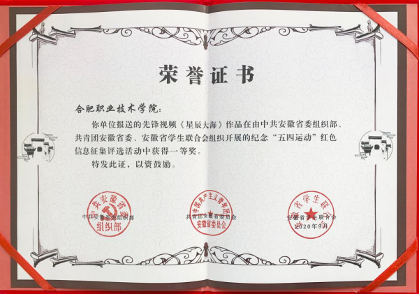 近日,由谈球吧团总支剪辑制作、校团委选送的先锋视频作品《星辰大海》在安徽省组织的纪念“五四运动”红色信息征集活动中荣获一等奖。