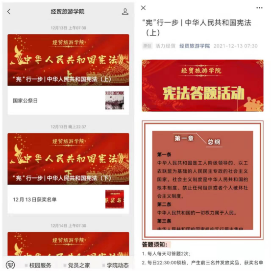 此次宪法学习有奖答题活动分为两个阶段。第一阶段,12月13日至12月17日,为期五天的宪法知识学习,公众号每日推送一篇宪法知识内容,每日20题,学习宪法基础知识,增强守法、知法意识。第二阶段,12月18日,历经了5天的基础知识学习后,开启最终较量——宪法知识有奖竞答。参与的同学都有在线礼包赠送,3名优胜者还获得特别的奖品。这种新的学习形式赢得了众多师生积极参与,有奖竞答当天参与人数就有1000多人