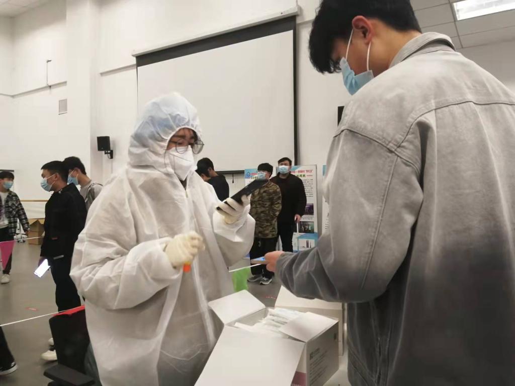 在老员工活动中心,党员志愿者是最严谨的核酸信息登记员。他们身穿层层包裹的防化服,一工作就是数个小时。不能喝水不能上洗手间,目标就是为了帮助每一位同学尽快完成核酸检测。