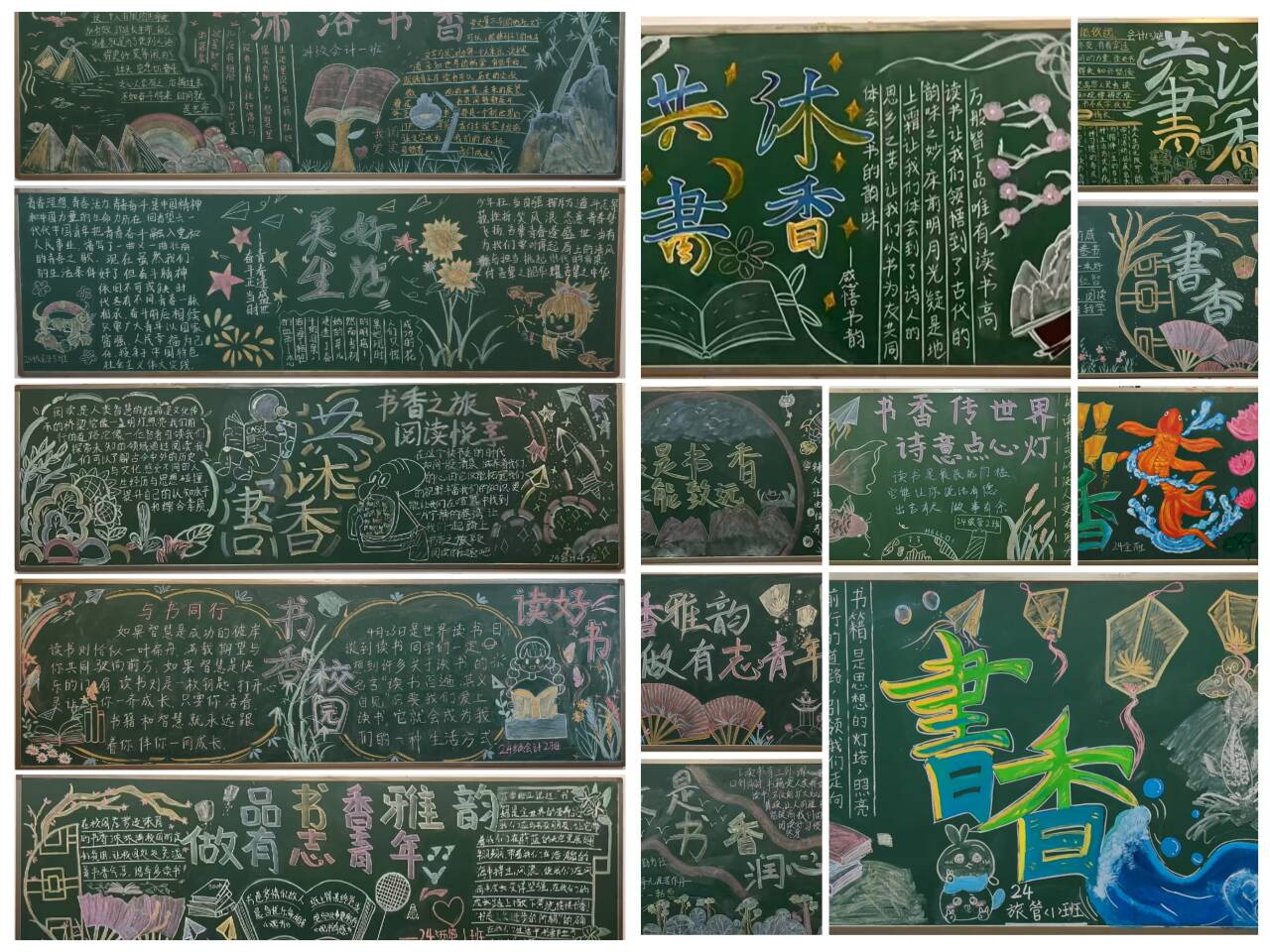 各班级充分发挥团队合作精神,同学们积极参与,各展所长。大家围绕“书香校园”这一主题,用绚丽的色彩、生动的文字和精美的图案,将黑板报装扮得各具特色。有的班级以古代文人墨客的诗词为背景,展现了中华文化的博大精深;有的班级则通过推荐一本好书,引导同学们养成阅读的好习惯;还有的班级将同学们阅读时的场景描绘在黑板上,营造出浓厚的阅读氛围。 经过一番精心创作,一幅幅主题鲜明、内容丰富、形式多样的黑板报呈现在大家眼前。