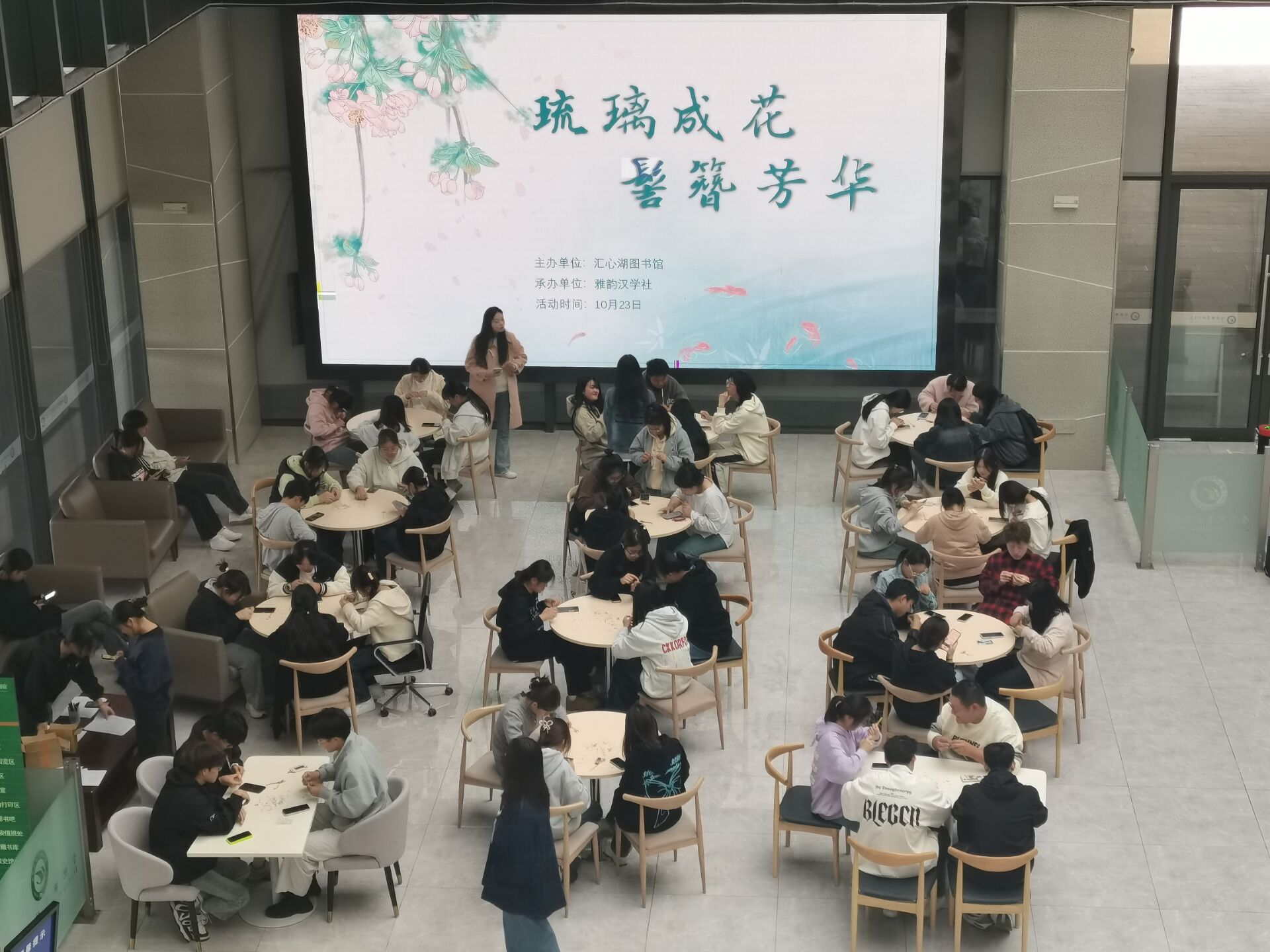 为传承和弘扬中华传统文化,丰富广大在校同学文化生活,谈球吧雅韵汉学社于10月23日下午在汇心湖校区图书馆二楼举办了一场别开生面的“琉璃成花,髻簪芳华”活动。