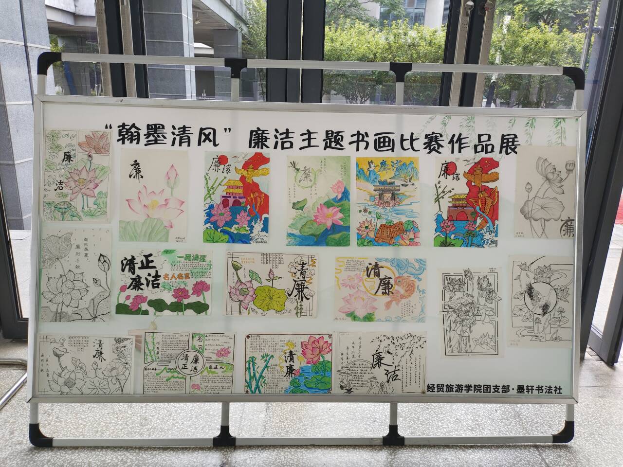 活动启动后,师生踊跃参与。大家紧扣“廉洁”主题,结合诚信考试周,挥毫泼墨、精心创作。展出的作品题材丰富,形式多样,涵盖硬笔书法、软笔书法及绘画三大类别,共计58件精品力作。硬笔书法笔力遒劲,彰显规矩方圆;软笔书法墨韵悠长,传递清廉意境;绘画作品构思巧妙,寓意深刻。作品内容或取材于廉洁历史典故,或摘录自廉政格言警句,或反映现实生活中的廉洁实践,充分展现了经贸师生对廉洁文化的深刻理解和艺术表达,将抽象的廉洁理念转化为可触可感的艺术形象。
