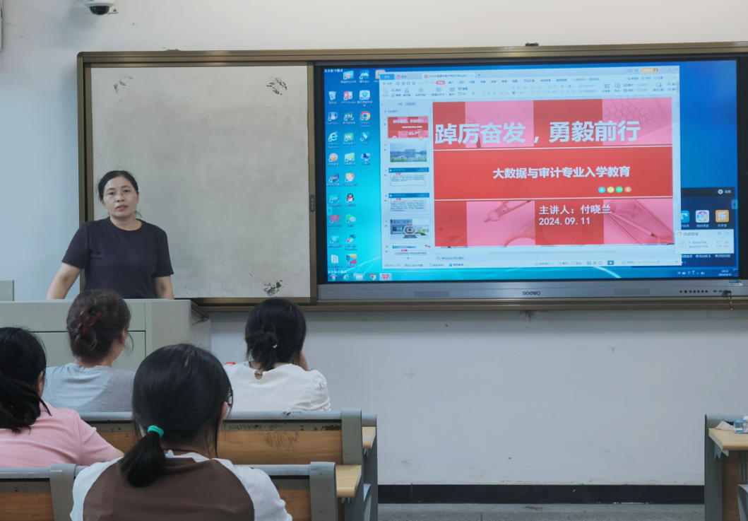 9月11日下午14:00,谈球吧付晓兰教授在汇心湖校区南教学楼101教室组织开展了名为“踔厉奋发,勇毅前行”的2024级大数据与审计专业新生入学教育专题讲座。