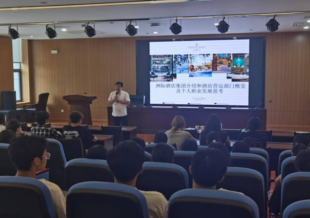 在图书馆一楼报告厅,2024级酒店管理与数字化运营专业的新生入学教育,分为”洲际酒店集团和酒店运营其个人职业发展思考”的专题讲座和专业介绍两个部分开展。洲际酒店高管王晓洁介绍了世界一流品牌酒店集团——洲际酒店在中国的发展历程、发展规模、洲际酒店集团运营的模式、个人职业选择及洲际酒店集团人才发展成长路径等方面的情况,专业负责人杨世河教授对酒店管理与数字化运营专业的教学情况、取得的成绩及主要特色作了详细讲解,员工们听得认真,现场互动氛围十分热烈。