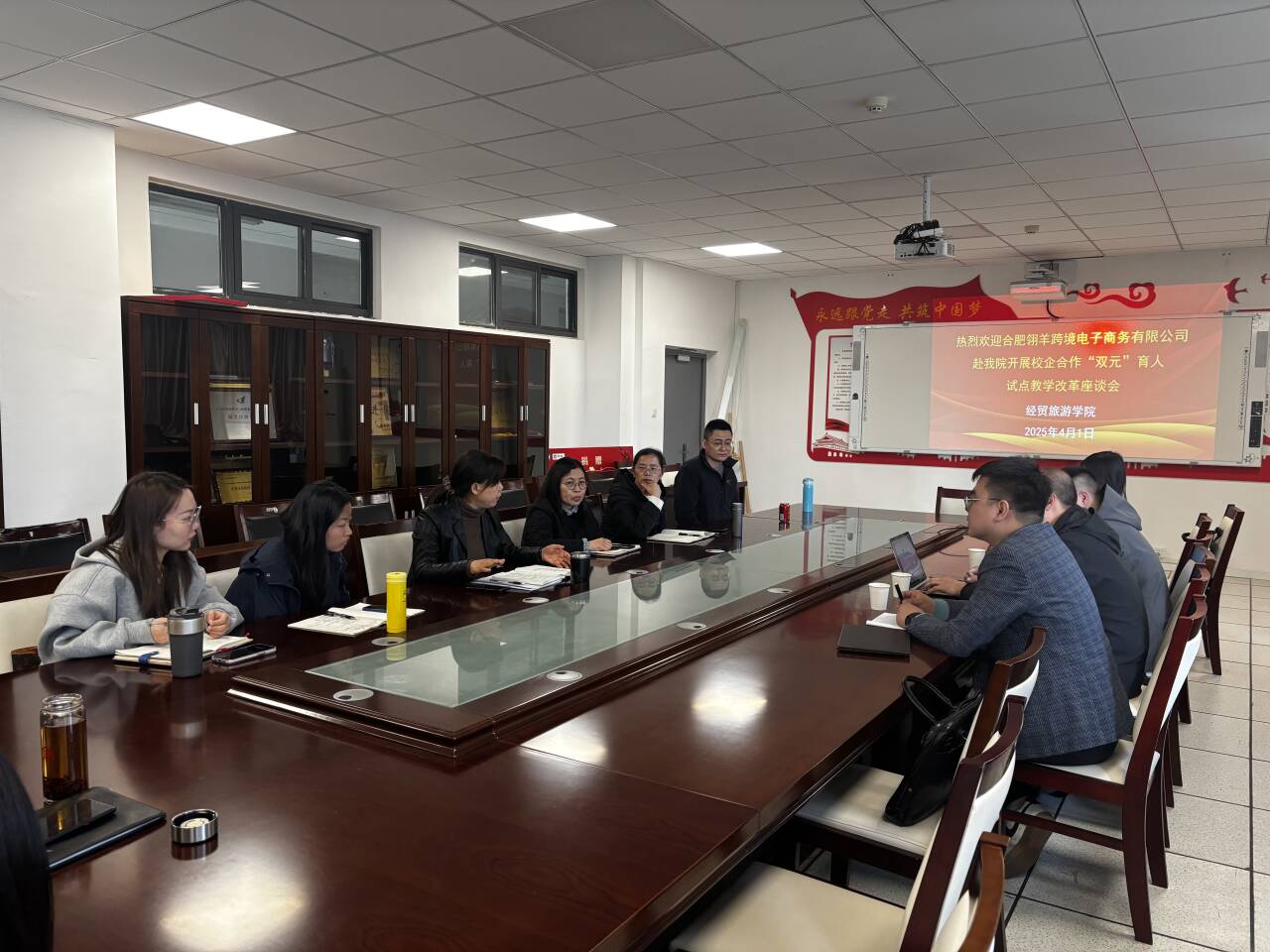 4月1日下午,公司召开试点教学改革座谈会,赵红经理、付晓兰副经理及电商教研室全体教师与企业代表荣庆经理、朱益南经理等人进行深入交流。会议围绕实践教学项目设计、课程衔接、考核标准等展开研讨,企业方结合行业趋势提出合理化人才培养建议,校方就教学实施细节与企业达成共识,为次日推进会奠定基础。