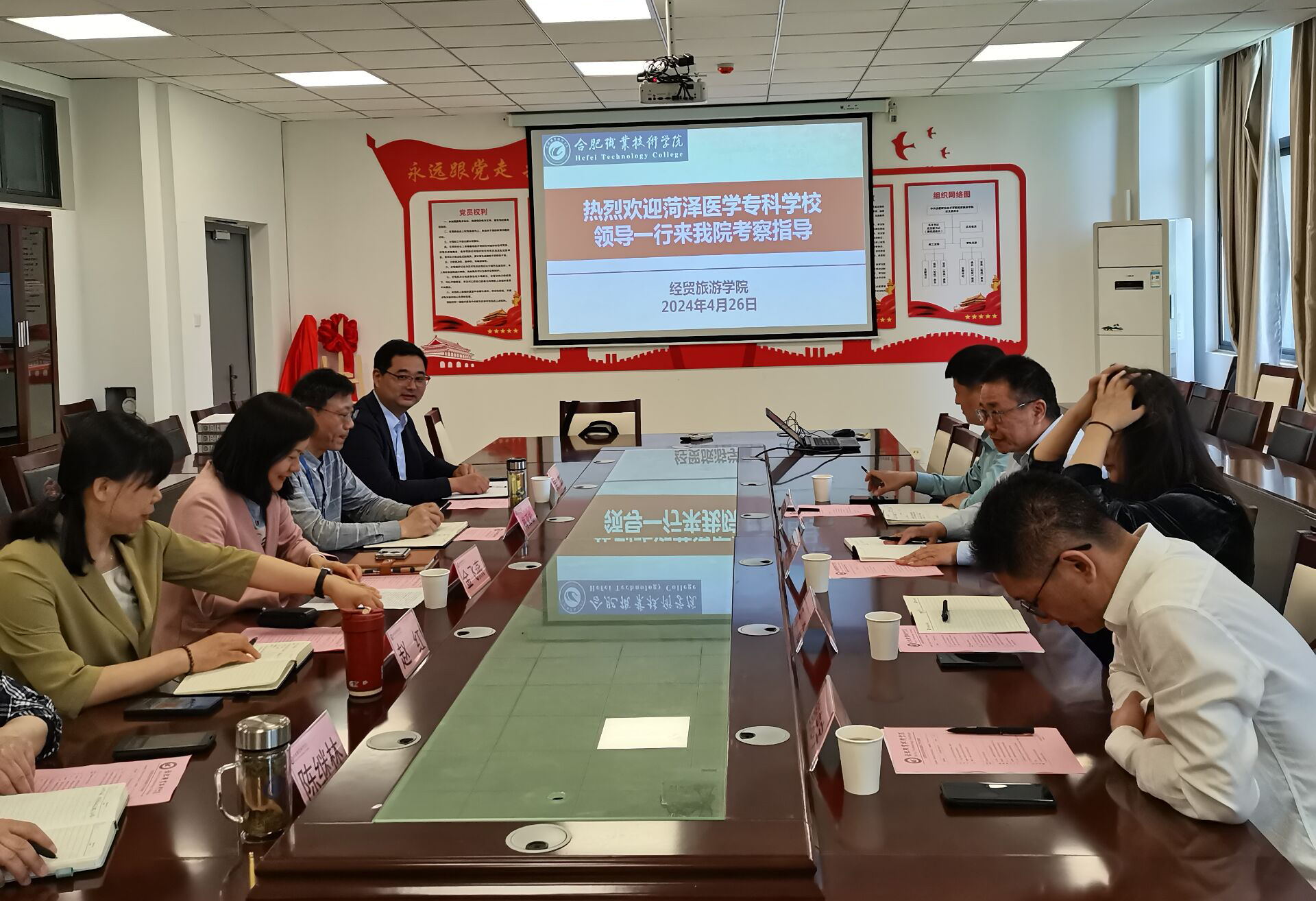 4月26日上午,山东菏泽医学专科公司党委委员、副董事长齐云飞,校团委书记于淼,员工工作处副处长刘建海,济南市仁客创业服务总经理鲍忠宇等一行四人就创新创业工作来谈球吧开展调研交流。公司党委副书记金飞燕、公司党总支书记梅亚松、经理赵红、副经理陈继林、安徽梦森科技有限公司董事长吴捷等在经贸南楼会议室接待了来访客人。